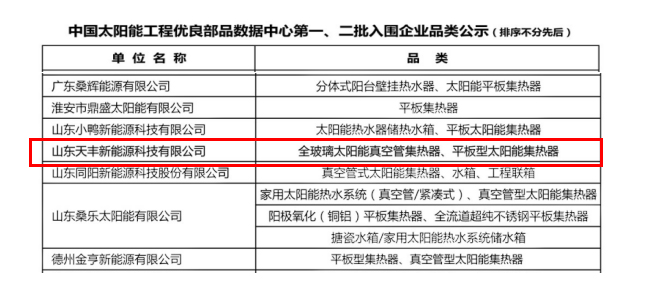 2018年10月,全國首個“中國太陽能工程優(yōu)良部品數(shù)據(jù)中心”成立,山東天豐新能源科技有限公司太陽能系列產(chǎn)品成功首批入圍!
