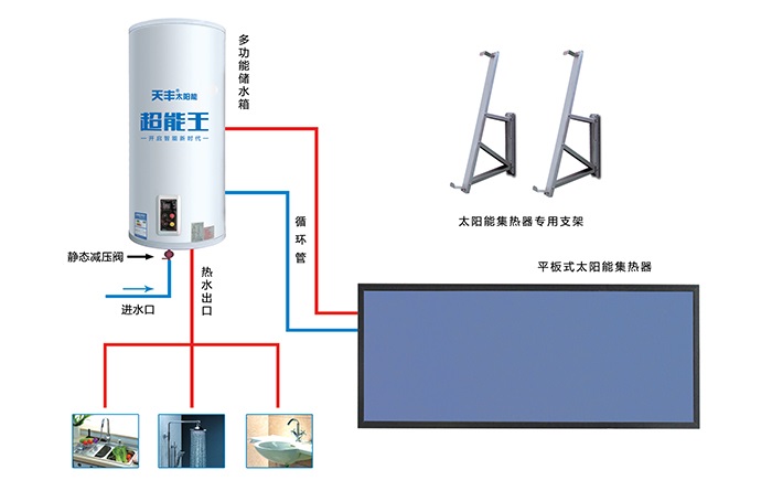 本系統(tǒng)采用天豐陽臺壁掛分體式太陽能熱水機,吸熱部件(太陽能集熱器)與儲熱部件(水箱)分離式安裝,集熱器安裝于南面陽臺上,儲熱部件(水箱)安裝于室內(nèi)陽臺上,然后通過管路把太陽能集熱器、水箱和室內(nèi)衛(wèi)生間、廚房等用熱設備相連接的一種分戶集熱、分戶儲熱式太陽能熱水系統(tǒng),整個系統(tǒng)為承壓式運行,間接加熱。